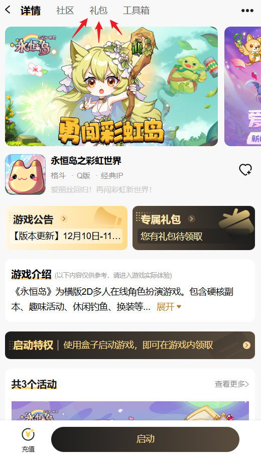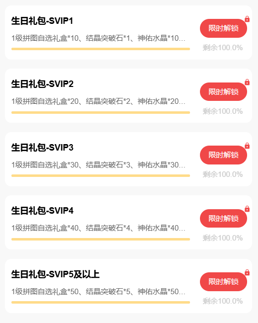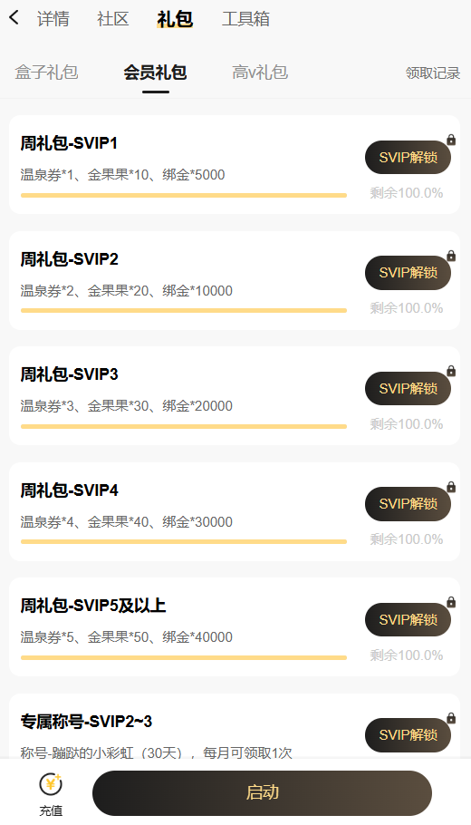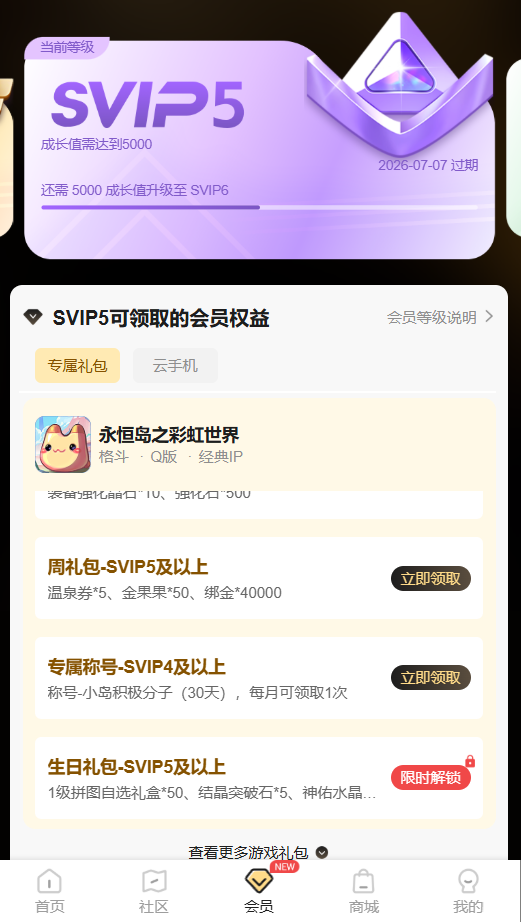 39游戏盒子SVIP福利升级免费领! 游戏充值即可同步解锁39游戏盒子SVIP,每周领取温泉券、金果果、绑金等实用好礼,生日更有限定拼图、突破石、神佑水晶等珍稀资源放送! 称号加持、养成加速,助力让你的岛屿生活更加轻松愉快~ SVIP会员每周均可领取专属礼包,温泉券、金果果、绑金随心用......每周登录即可领取,日常冒险更轻松! 在你生日当月,我们为SVIP会员准备了一份特别心意!专属祝福,陪你度过游戏内外的温馨时刻。 不同VIP等级对应不同酷炫称号!SVIP2与SVIP3每月可免费领取“蹦跶的小彩虹”,SVIP4及更高等级每月可免费领取“小岛积极分子”,彰显身份,漫步岛屿更显个性! 注意:SVIP1~SVIP4可领取对应等级的礼包;SVIP5及更高等级统一领取SVIP5礼包。 进入“39游戏盒子”-“永恒岛之彩虹世界”社区找到“礼包”-“会员礼包”领取专属权益; 进入“39游戏盒子”-“会员”页面SVIP等级下方找到“永恒岛之彩虹世界”领取专属权益。 注意:不同礼包领取条件有所不同,可以点击查看对应礼包的详情介绍。 ●进入“39游戏盒子”-“会员”页面; ●可在当前页面查看当前SVIP成长值及下一等级进度; ●可通过游戏内充值、盒子消费、公众号充值……所有渠道的投入均累积为SVIP成长值,成长值达标自动升级(详细规则可在“会员规则”中了解)。 提升你的SVIP等级,解锁更多福利